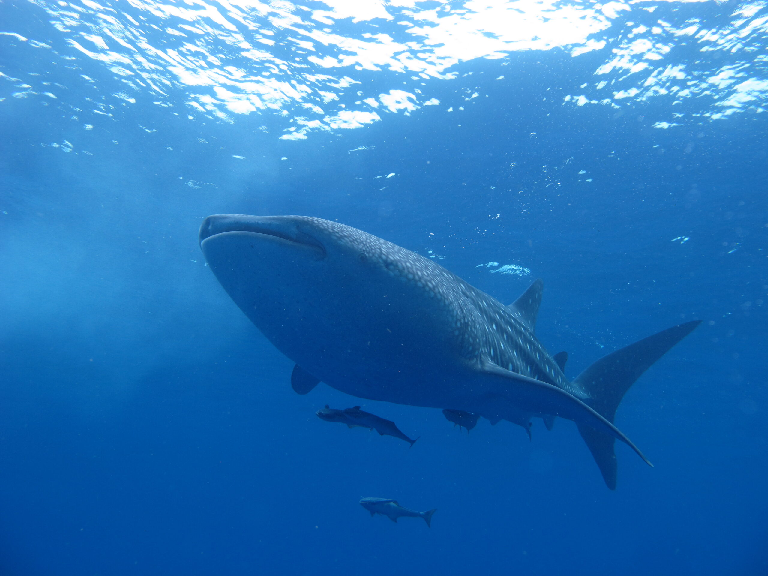 Even if no whale sharks are seen, dives at Gladden Split can still be quite a remarkable experience. In addition to the tons of Cubera, dog and mutton snapper there are often schools of jacks. You can expect to see some predators such as reef sharks and bull sharks with the occasional hammerhead that come to feed on the snapper. Dolphins are frequent visitors. One of our guests said that her whale shark trip with no whale sharks sighted was the best dive she had ever done when dolphins were repeatedly diving for snapper and returning to the surface to swallow them!